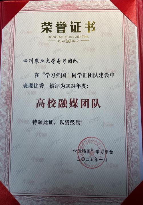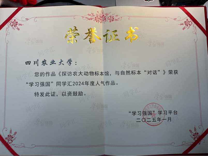 近日,“学习强国”学习平台公布“学习强国”同学汇2024年度人气作品Top100、高校融媒团队Top50名单。我校党委宣传部指导的学生团队枣子团队获评“学习强国”同学汇2024年度高校融媒团队,枣子团队作品《探访农大动物标本馆,与自然标本“对话”》获评“学习强国”同学汇2024年度人气作品,登上学习强国全国及四川平台首页推荐。