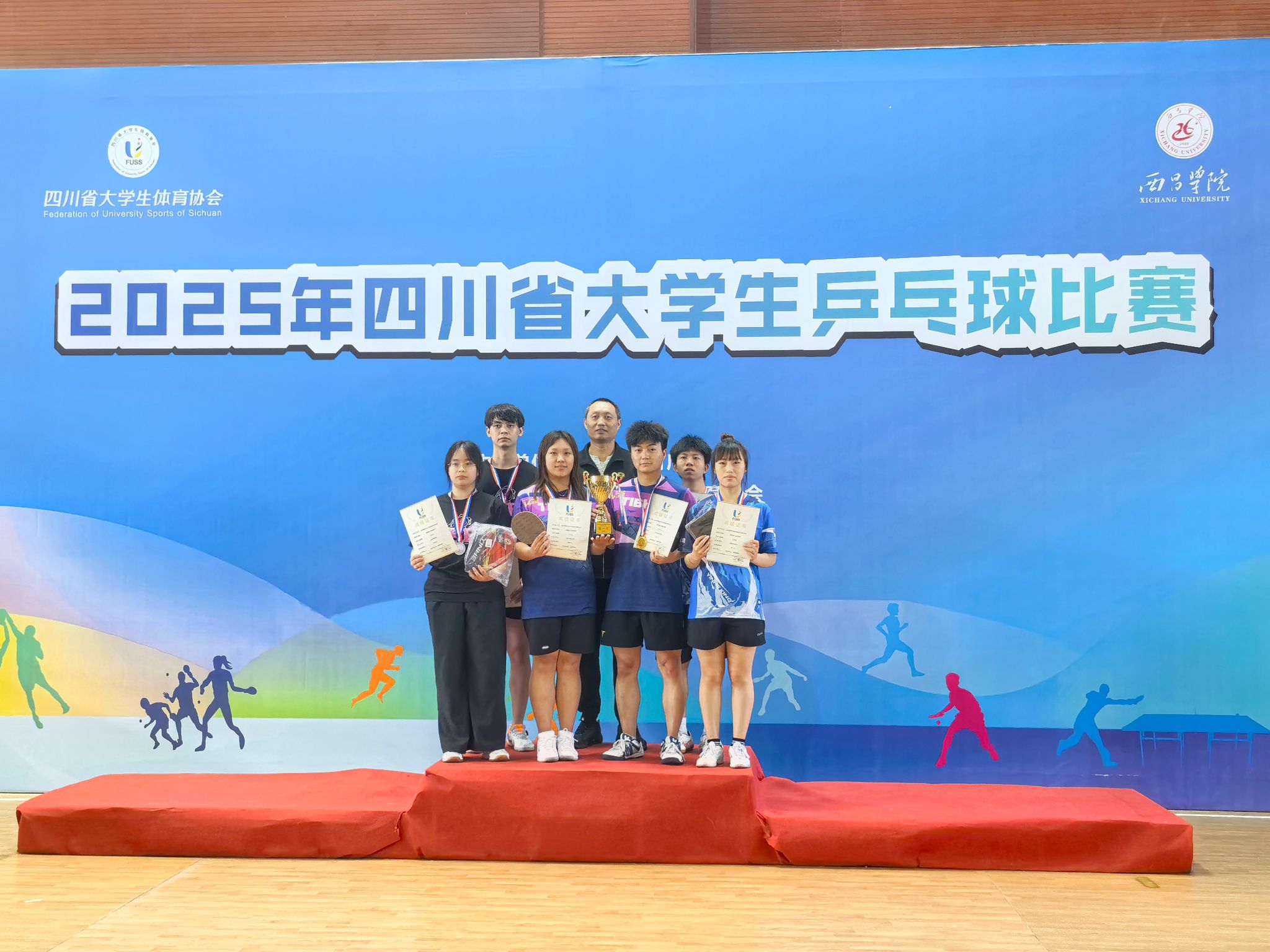 5月25日-29日,由四川省教育厅主办,四川省大学生体育协会执行,西昌学院承办的2025年四川省大学生乒乓球比赛在四川西昌举行。来自四川大学、电子科大、西南财大等全省的75支队伍800余名运动员参加比赛。其中,我校校园组的混双组合(廖叙、薛雯予)成功卫冕,蝉联冠军,延续了我校代表队在校园组该项目中的历史最佳成绩。