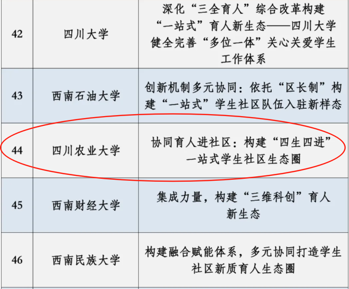 目前,获评的优秀项目已纳入全国高校思想政治工作网资源库,并在“一站式”学生社区综合管理模式建设工作云平台和高校思政网微信公众号进行集中展示。学校将进一步深化“三全育人”综合改革,协同推进“立德树人”机制综合改革试点,持续完善“一站式”学生社区建设,不断提升社区育人实效,为培养知农爱农的新型人才提供坚实支撑。