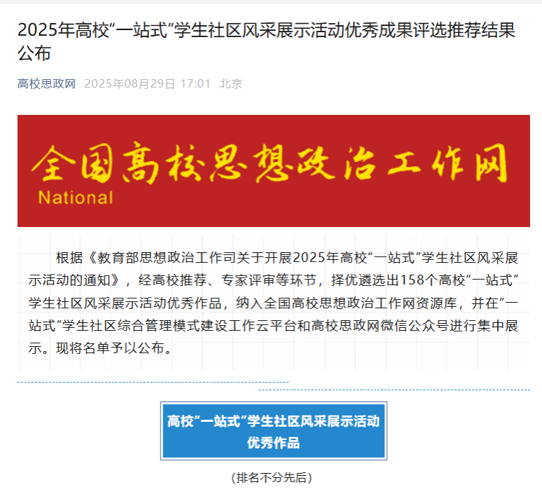 8月29日,教育部思想政治工作司公布了2025年高校“一站式”学生社区风采展示活动优秀作品名单。本次风采展示活动涵盖党建引领、队伍入驻、学生参与、文化建设、数字赋能、条件保障六个方面,经高校推荐、专家评审等环节,全国共遴选出158个优秀作品,我校《协同育人进社区:构建“四生四进”一站式学生社区生态圈》和《破解学生参与“无形厚障壁”,激活社区治理新动能》成功入选优秀作品。