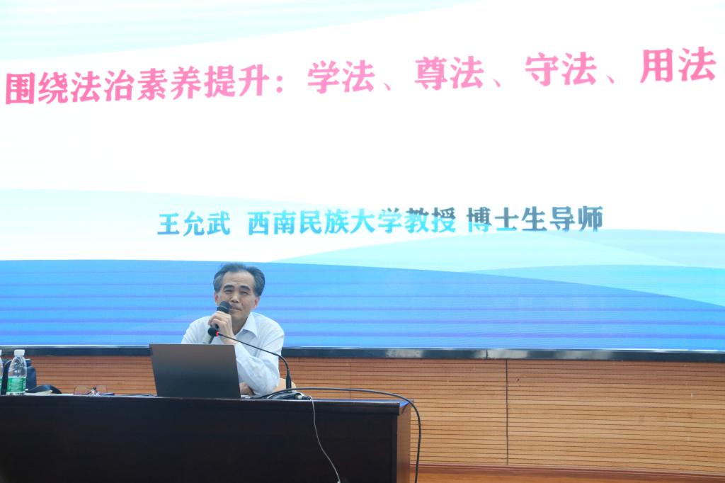 为切实提升全院师生法纪意识,健全法律知识,强化法纪观念,提升法治素养,环境学院从本学期起专门开设“法治大讲堂”,邀请国内一线“青少年法制教育专家”来校宣讲法律知识,普及法治案例。6月17日下午,四川省“青少年法制教育中心”评估专家、四川省法学会副会长、西南民族大学法学院院长王允武教授,以“围绕法治素养提升学法、尊法、守法、用法”为主题,为环境学院现场200余名教师、研究生及线上各年级本科生作专题报告,并以此拉开了学院“法治大讲堂”系列活动的序幕。