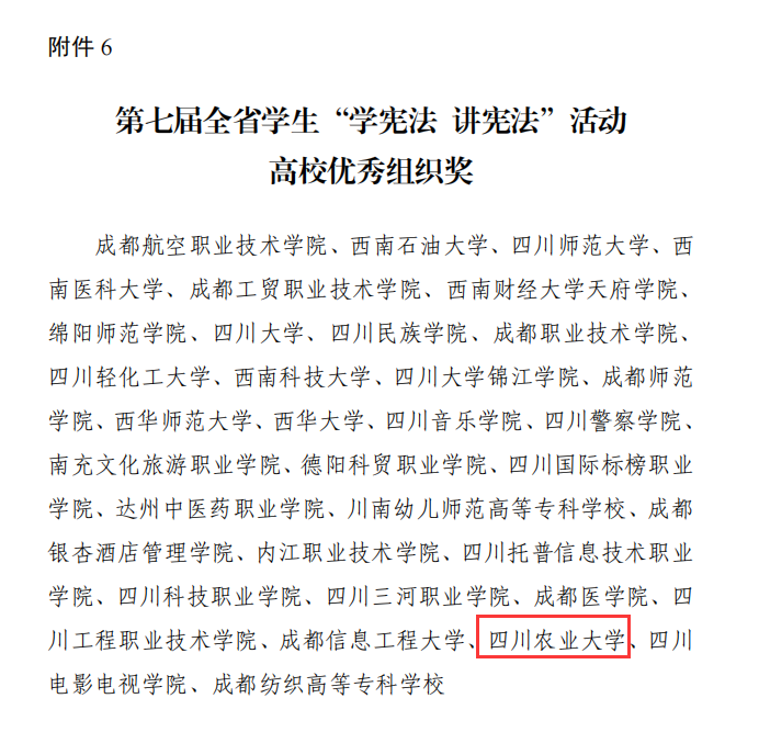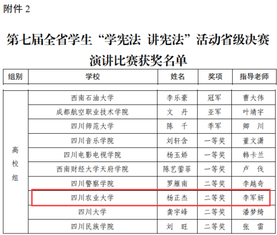 日前,中共四川省委教育工委办公室、四川省教育厅办公室公布了第七届全省学生“学宪法 讲宪法”活动获奖名单,我校喜获高校优秀组织奖,杨正杰同学荣获省级决赛演讲比赛二等奖和省级本科高校大学生竞赛三等奖。