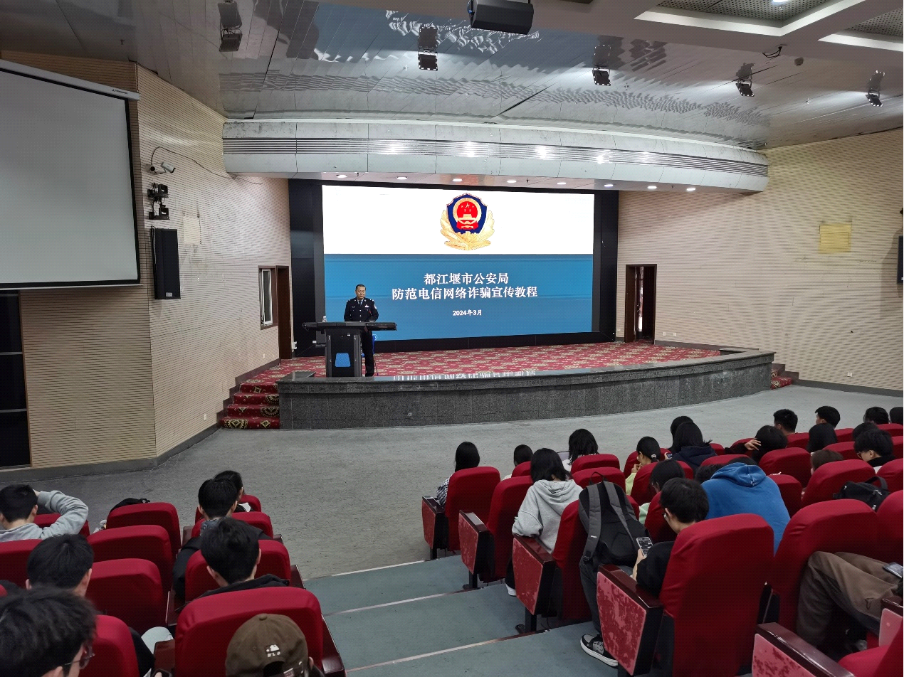 3月20日,在都江堰校区图书馆报告厅,都江堰市公安局南桥派出所吕鹏警官以真实案例为切入点,向近300名师生详细讲解了“买卖游戏装备”“冒充老师熟人”“网络兼职刷单”“冒充客服诈骗”“杀猪盘”“校园贷”“短信电话中奖”等师生群体多发的诈骗类型,为校园反诈知识“划重点”。他还围绕“什么是帮信罪”“如何预防参与涉诈犯罪”等内容,讲解了电诈犯罪的新变化、新特点,提醒大家切勿随意透露个人信息,勿贪图小利出租、出借银行卡和电话卡。他也向同学们发出倡议,鼓励大家争做“反诈”宣传员,向家人宣传“防诈骗”知识,提醒家人对网络诈骗陷阱时刻保持警惕。