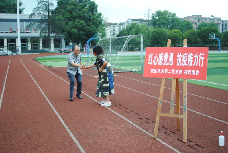 为庆祝党的99岁生日,7月1日,都江堰校区机关第二党支部联合校区团委共同举办了“红心感党恩 抗疫接力行”主题党日活动为党庆生。支部全体老师和团委各学生组织共99人分批来到运动场,根据身体实际情况通过快走或者跑步的形式进行接力赛,绕场99周表达师生党员同志爱党爱国的热情。