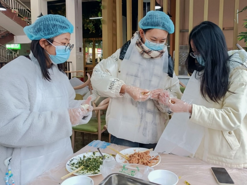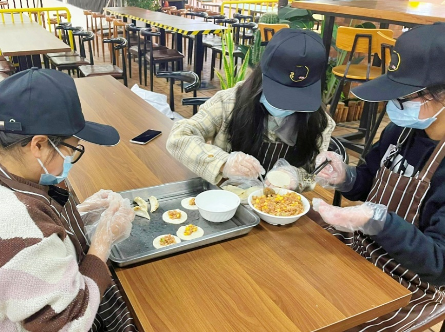 为了提高效率,有的小组分工明确,有的同学负责放馅料,有的负责包饺子,充分发挥小组成员的优势。很快,一张张饺子皮和一团团馅料在同学们手里变成一个个白白胖胖的饺子。大家一边包饺子,一边聊生活、学习中的趣事,现场充满了欢声笑语。