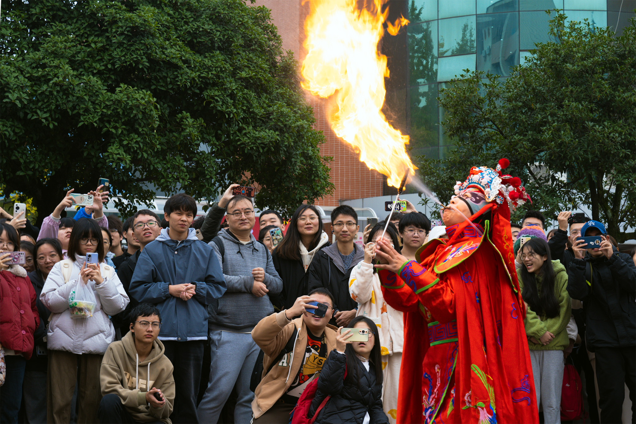 本次快闪活动邀请成都市、雅安市文联艺术家们携手我校16个学生社团为同学们带来皮影戏、木偶戏,四川清音、川剧变脸、传统武术、民乐、古诗词弹唱、汉服走秀等系列传统文化表演,吸引万余名同学驻足观看。