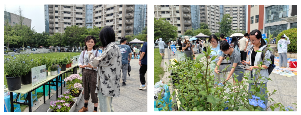 “朵朵鲜花朵朵开,谁是你的心头爱?”在川花展区,一盆盆小巧精致、色彩艳丽的花卉植物吸引着大家的眼球,整齐排列的各种本土植物研究应用成果宣传立台也让人目不暇接。“这里展示的是亮相本次成都世园会郫都分会场川花自主创新园的部分代表性花卉,如玲珑蓝角柱、小蓝雪、绣球花、金钗石斛等,它们都是由我校师生团队耗时多年攻关培育而成的具有自主产权,特色鲜明的‘川花’新品种”。来自风景园林学院高素萍教授团队的博士生黎熠睿还介绍到,“这些‘川花’品种经过培育和驯化改良,不仅是园林自然景观的优质材料,亦可广泛作为鲜切花或应用在花坛花境布置、道路绿化带及盆栽中。”