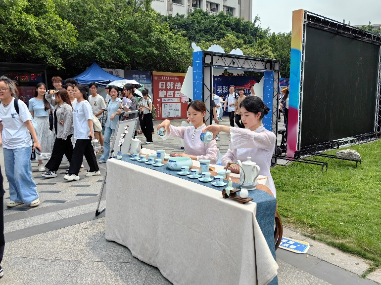 在科普展区的两端,人头攒动,同学们争相品尝、动手体验,现场好不热闹。原来是正在如火如荼的进行茶艺表演和插花花艺体验活动,只见茶艺表演者伴随着古风悠扬的音乐,手持茶具,轻盈翻动,水洒茶落。沏茶、赏茶、饮茶、评茶、赏艺,同学们不仅可以品味到茶的香气,更能感受到茶文化深厚底蕴,得到美的享受和情操的熏陶。