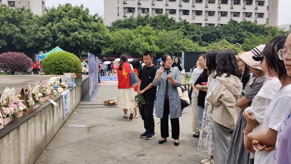 “插花艺术讲究高低错落、疏密有致、虚实结合……”在插花花艺展台,风景园林学院江明艳教授正在为同学们讲解插花艺术造型要素、技巧手法、色彩配置和注意事项,并结合现场插花展示,对参与者的创作作品进行现场指导。她表示,“成都世园会除了展示丰富的园艺花卉,匠心独运的插花花艺展示也是其中之一,这也是文化与园艺艺术交融的生动体现”。
