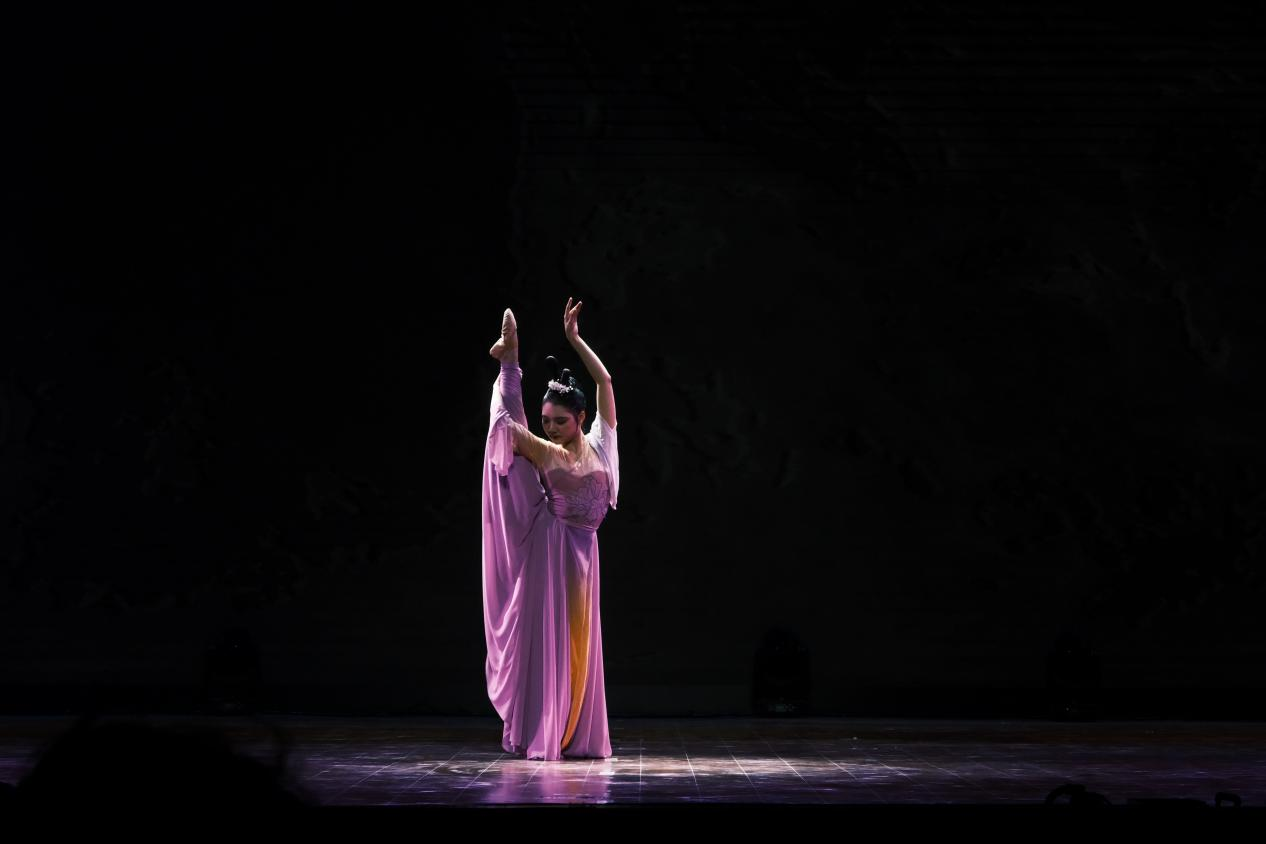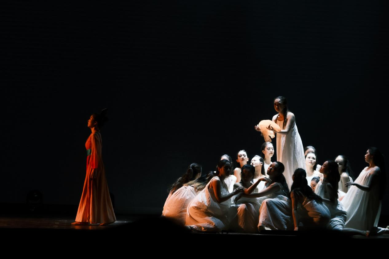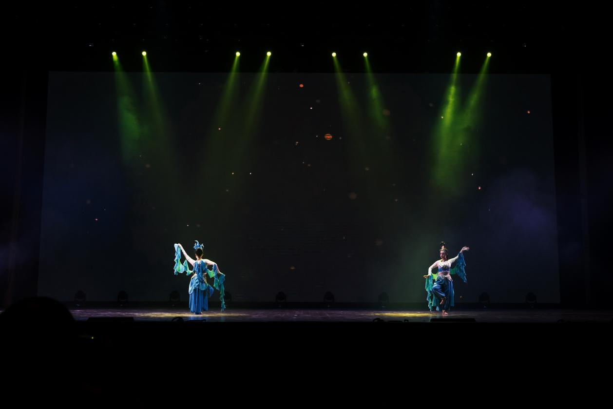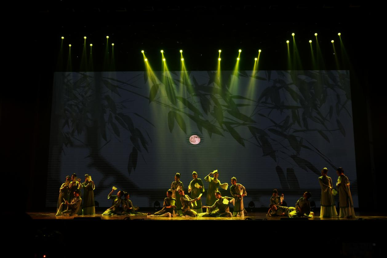 整场演出聚焦于我国文物流失问题,将身处异乡文物的思乡之情娓娓道来。“西北望长安,可怜无数山”,演出伊始第一篇章“梦·古韵”便紧紧吸引观众们的目光。古典舞《清风徐来》以清代《执扇就座仕女图》为创作蓝本,通过女子手持团扇的人物形象表现少女的温婉与灵动;胡旋双人舞《对影胡璇》将观众带入热情神秘的辽阔西域;傣族舞蹈《竹林掠影》,生动地表现出傣家姑娘在茂密的竹林中轻盈起舞的情景。海阳秧歌《溯跃》选取“鱼”的形象,同构“跃”的意象,寄语青年们踏沧浪而歌,逆流而上。