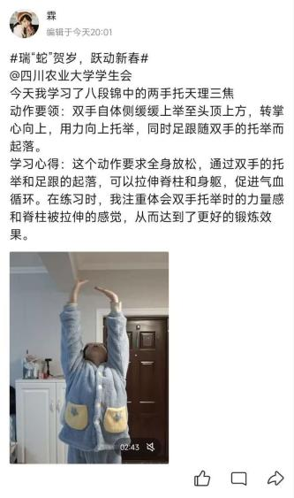 活动负责人钟滟介绍,本次活动不仅精心制作八段锦、太极拳等传统体育项目的教学视频,还通过运动APP搭建互动平台,创新性地将传统体育与现代科技相结合。“我们希望通过步数打卡、运动分享等形式,鼓励同学们在假期坚持锻炼,用健康活力的姿态迎接新年。”钟滟说道。